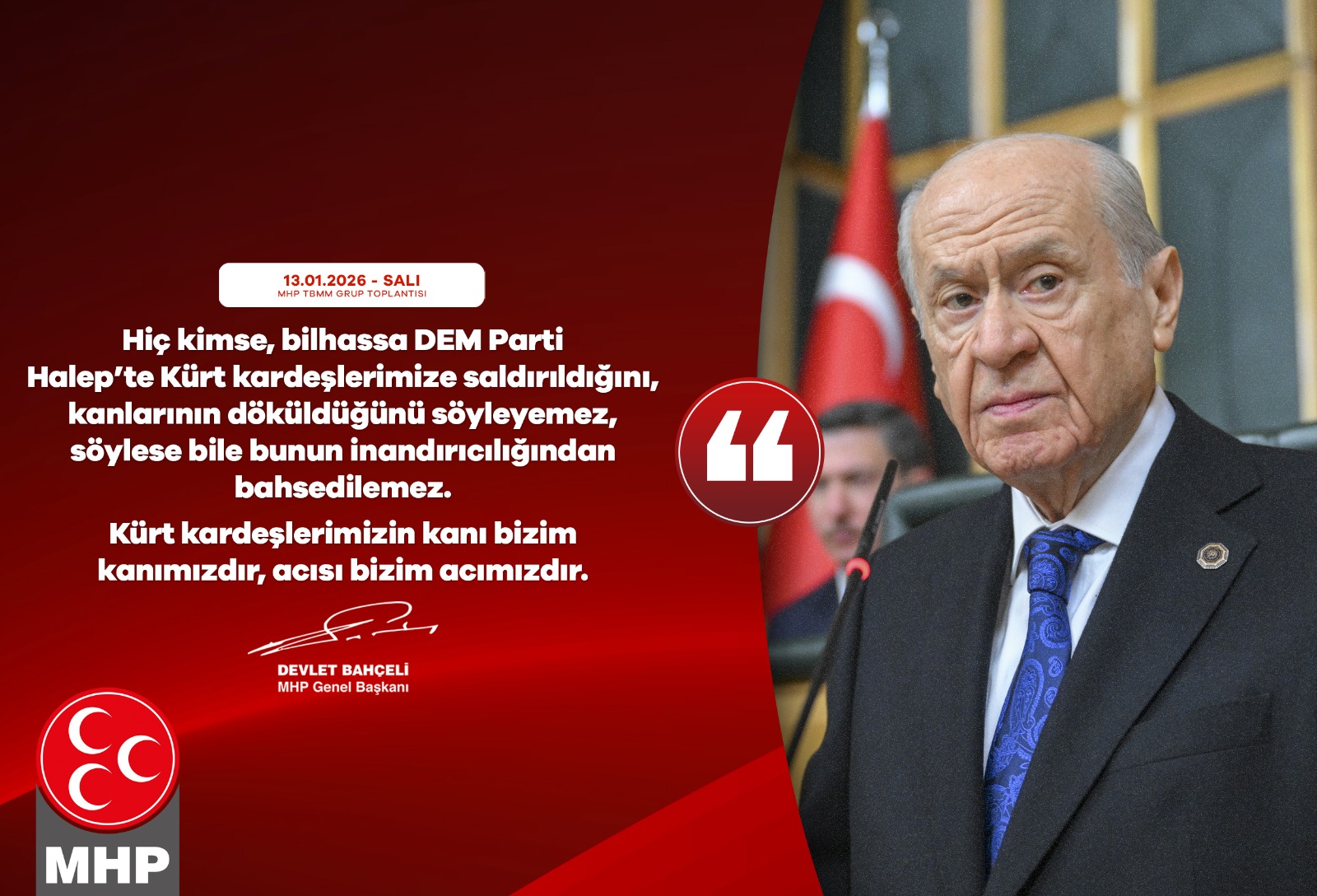Bahçeli açıklamasında, “Hiç kimse, bilhassa DEM Parti, Halep’te Kürt kardeşlerimize saldırıldığını, kanlarının döküldüğünü söyleyemez. Söylese bile bunun inandırıcılığından bahsedilemez” ifadelerini kullandı. MHP lideri, Türkiye’nin ve Türk milletinin Kürt vatandaşlarla kader birliği içinde olduğunun altını çizerek, etnik köken üzerinden siyaset yapılmasına sert tepki gösterdi.